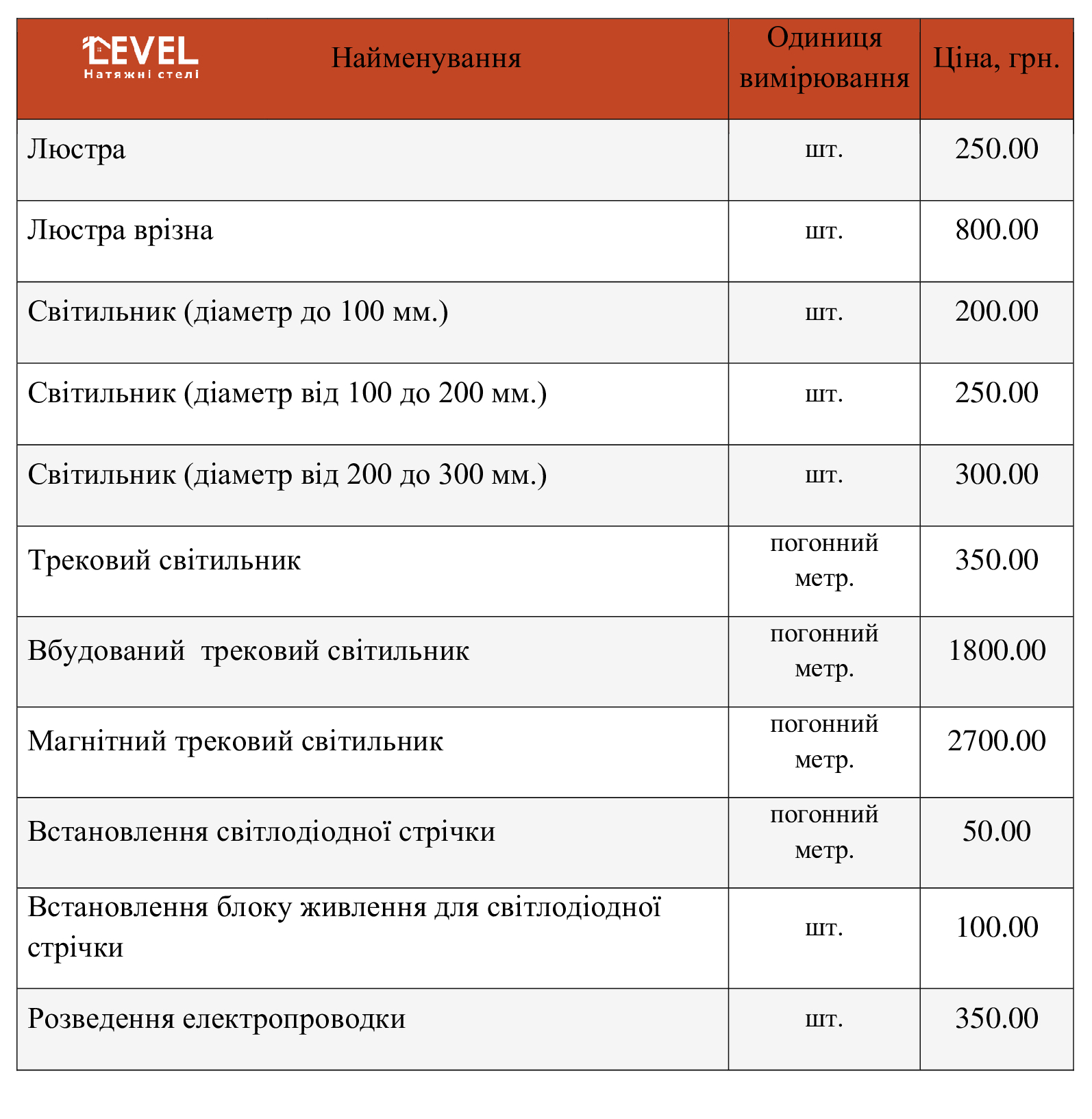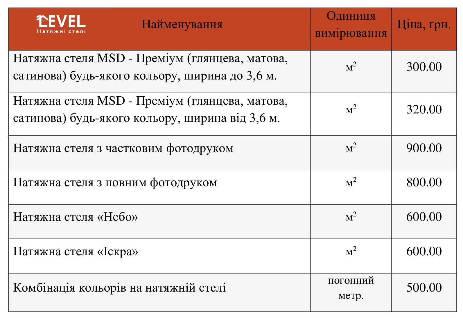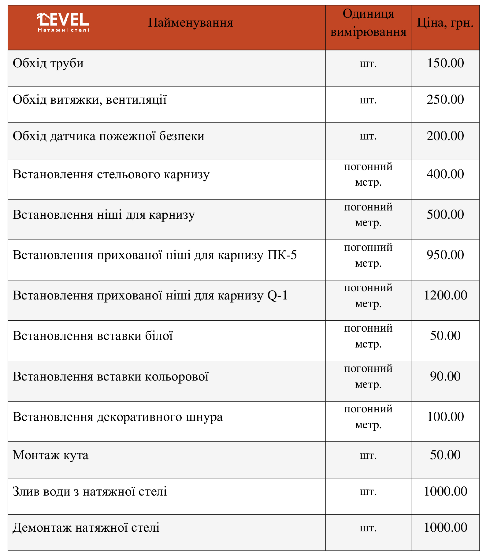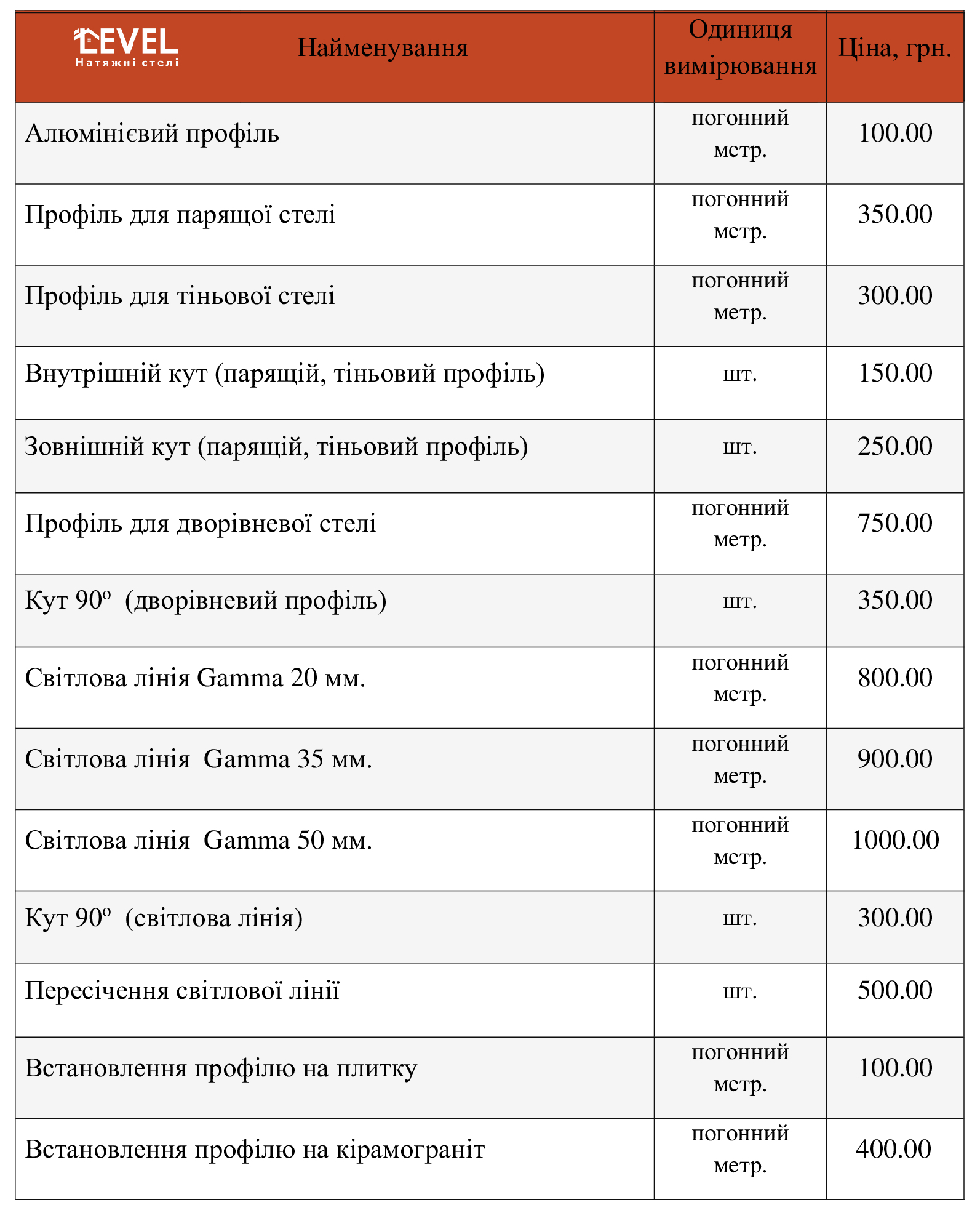 * Для розрахунку парящої, тіньової та дворівневої натяжних стель, до вартості за монтаж стелі додається вартість за монтаж профілю.