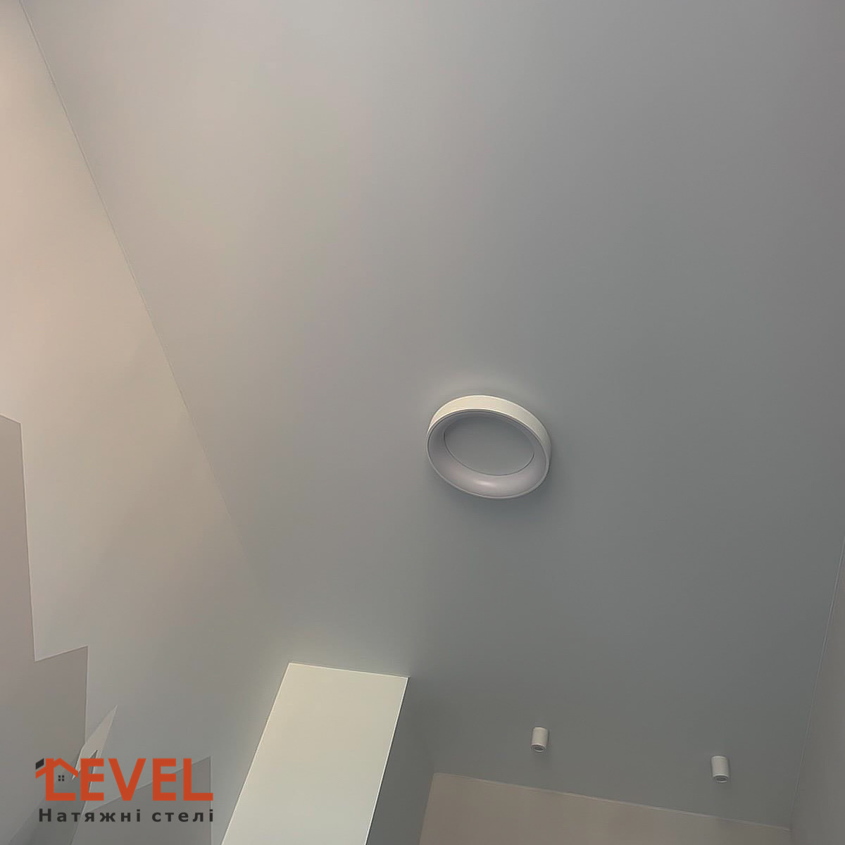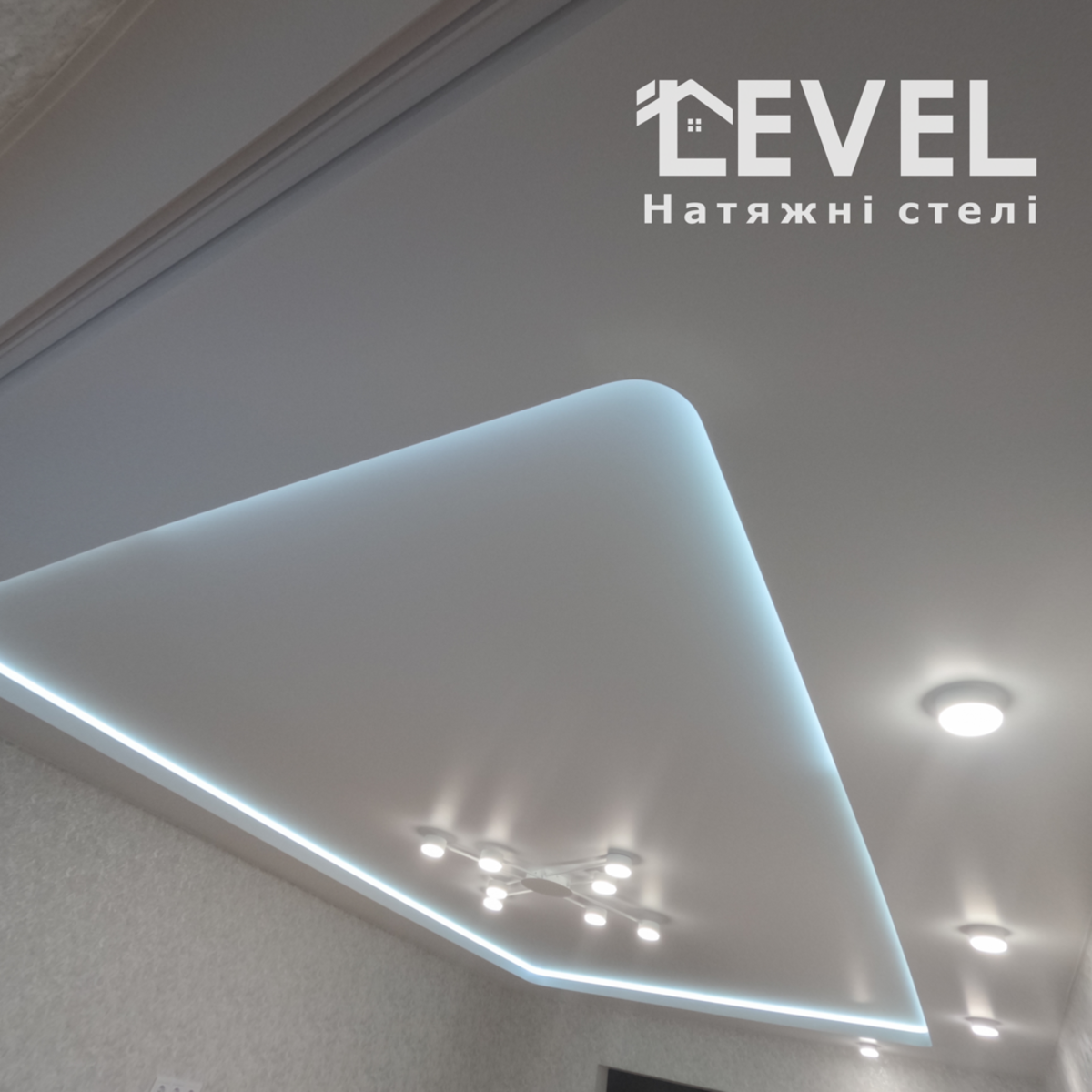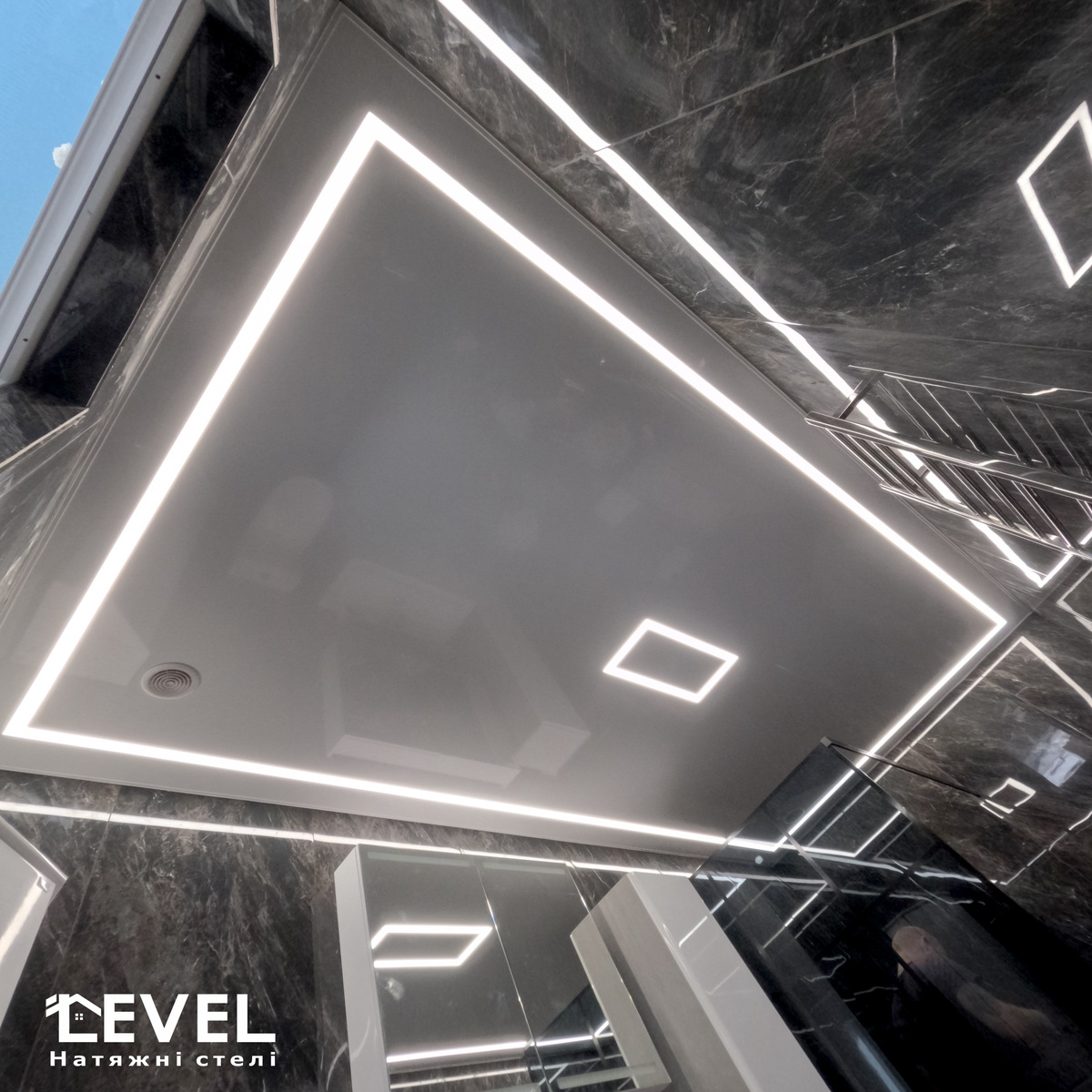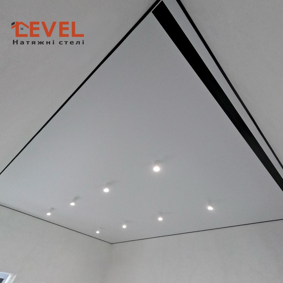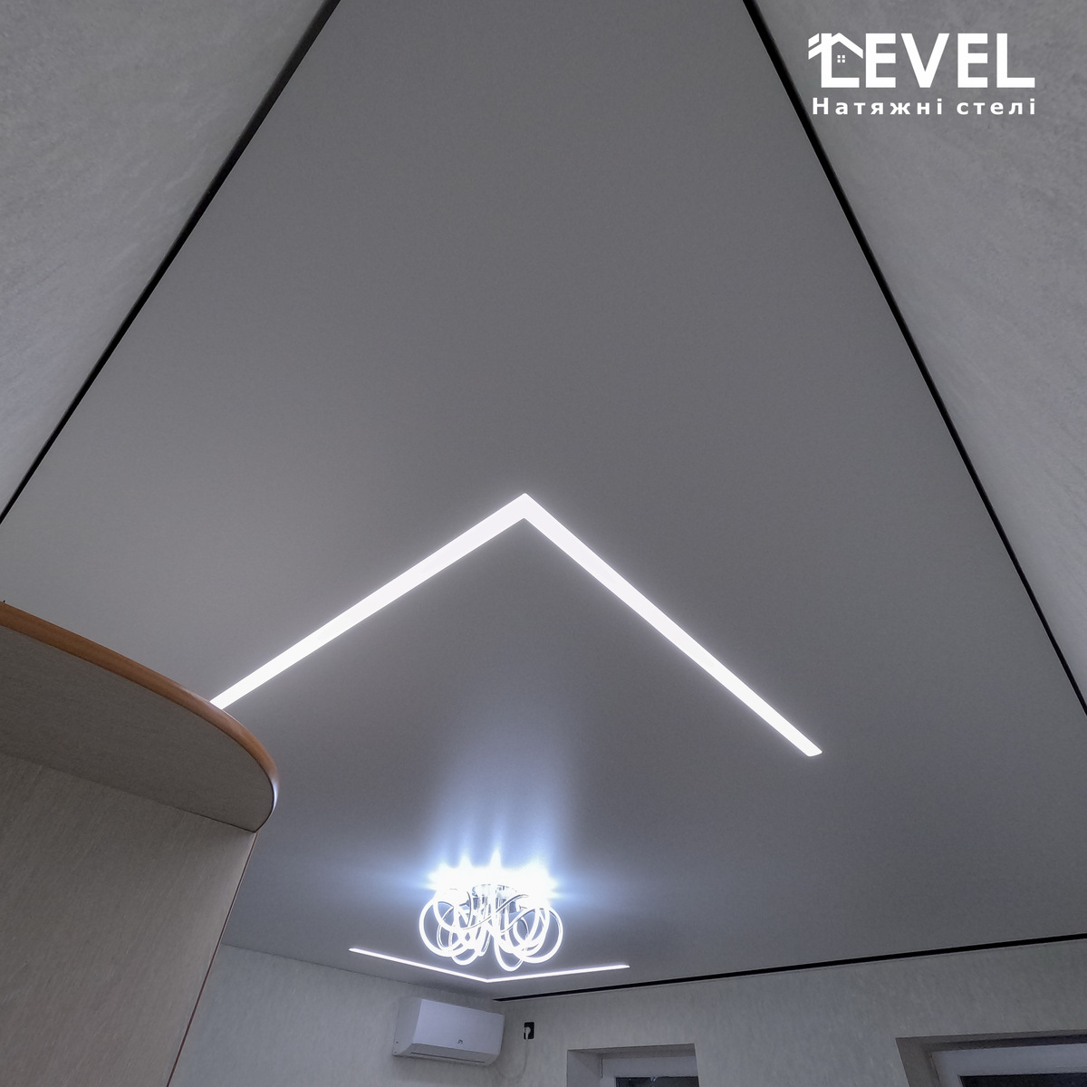 Парящя натяжна стеля, має глянцеву, матову або сатинову основу з боковим підсвічуванням. Така стеля створює ілюзію зависання в повітрі і надає приміщенню неповторну атмосферу.