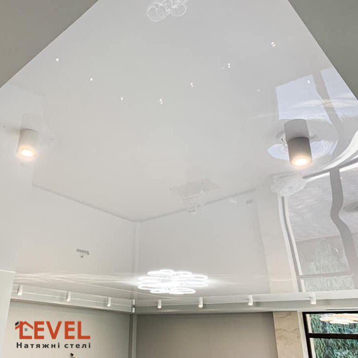 Глянцеві натяжні стелі виготовляються із плівки ПВХ. Для такого виду натяжних стель характерні блиск і високі здібності відзеркалення.