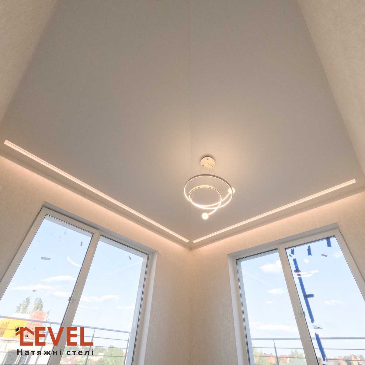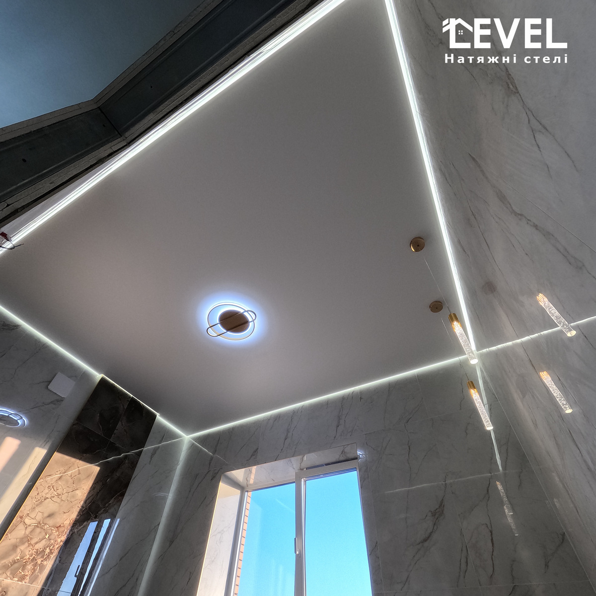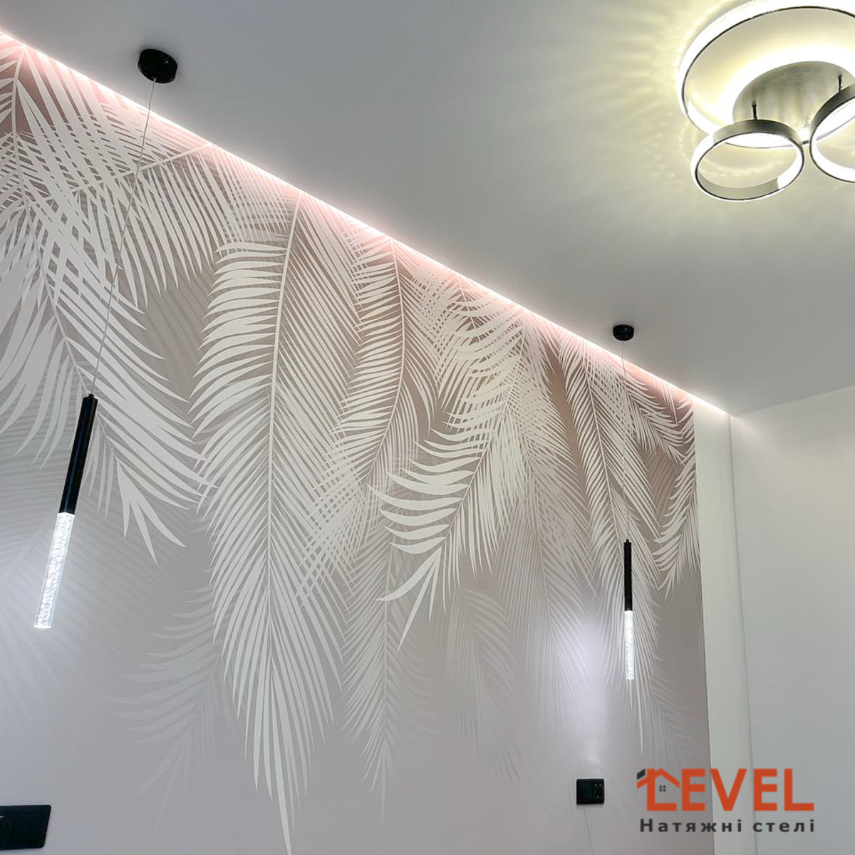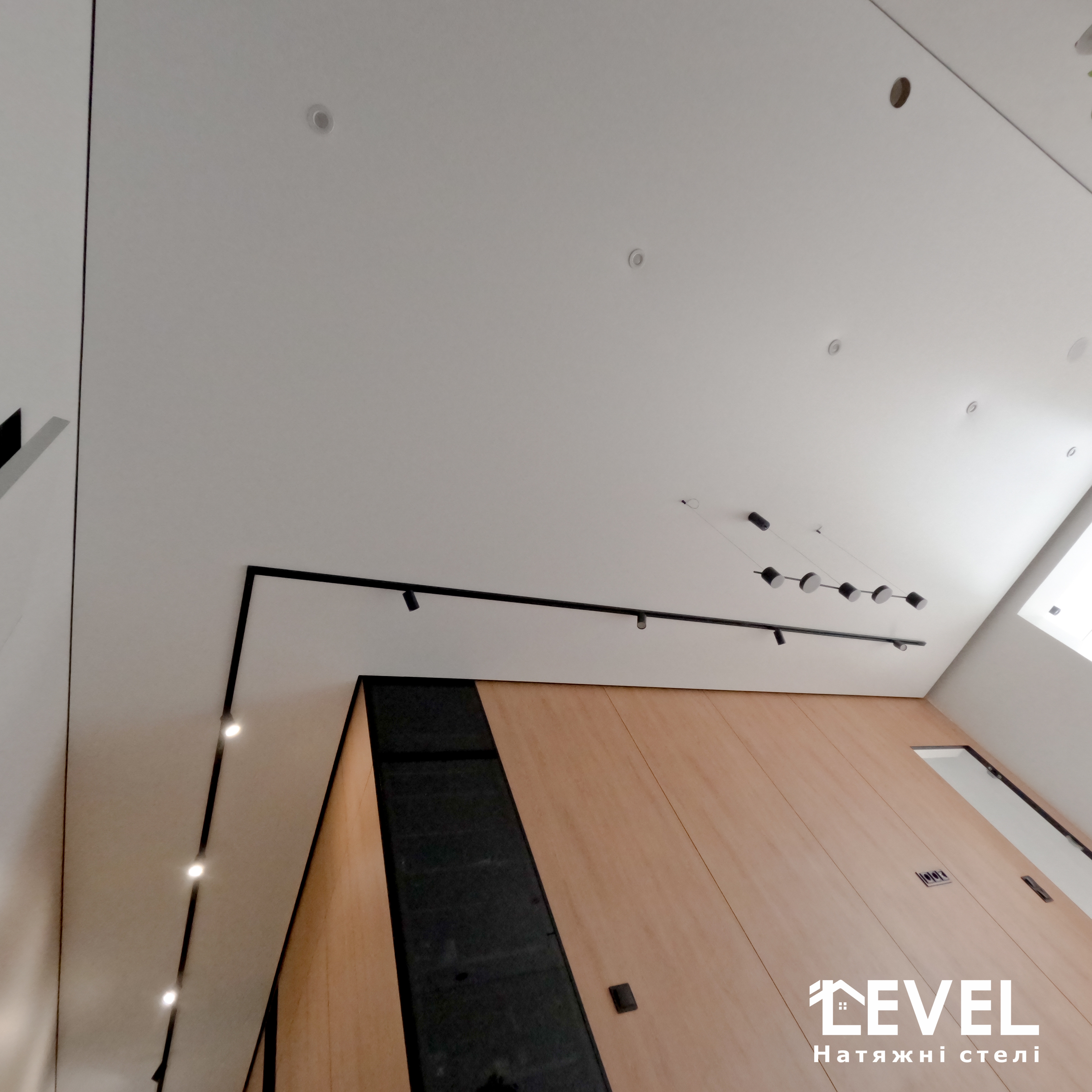 Парящі натяжні стелі роблять приміщення візуально більш високим.
