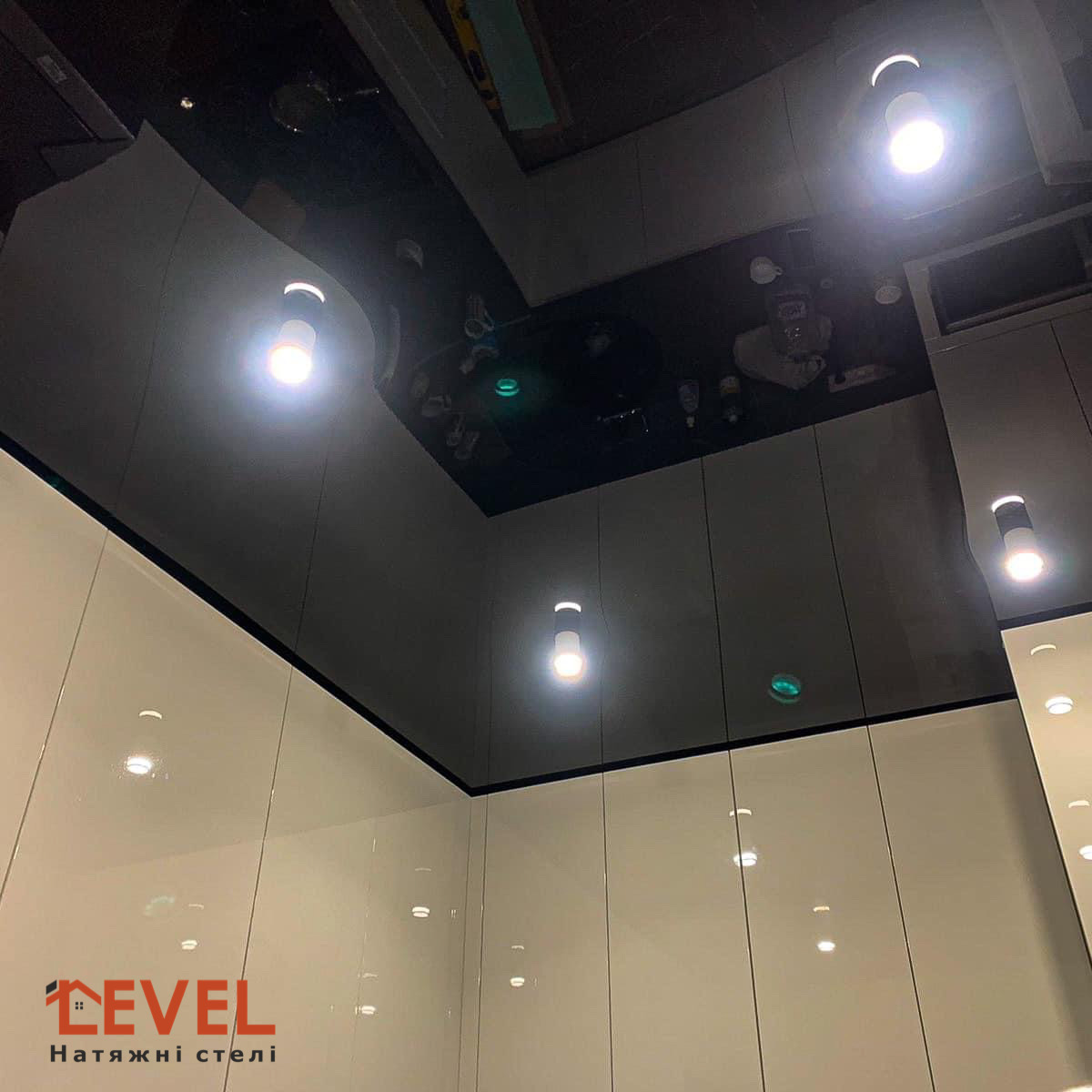 Колір стелі може бути абсолютно будь-яким: від чисто білого до чорного. Чим темніше полотно, тим чіткіше у ньому відображуються предмети.